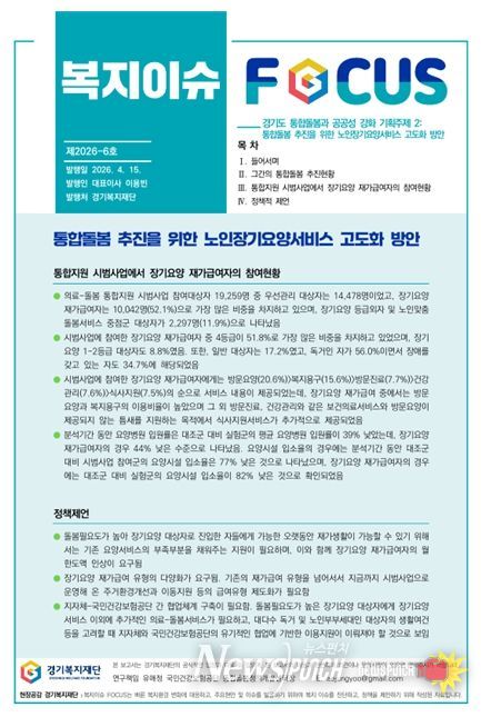 뉴스펀치 박상훈 기자 | 경기복지재단(대표이사 이용빈)은 통합돌봄 정착을 위한 노인장기요양서비스 고도화 방안을 주제로 '복지이슈포커스 제6호' 보고서를 발간했다.