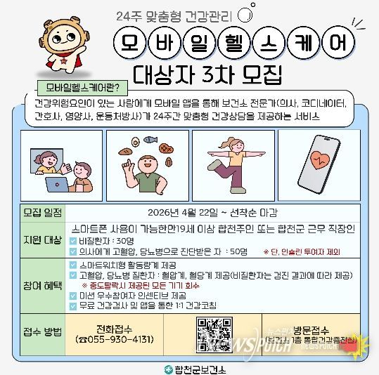 뉴스펀치 박세훈 기자 | 합천군보건소(소장 안명기)는 22일부터 모바일헬스케어 대상자 3차 모집을 시작한다.