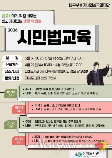 뉴스펀치 박세훈 기자 | 창원특례시 진해도서관(과장 이영화)은 오는 5월 매주 수요일 저녁 7시에 시민의 법률 이해도 향상과 일상 속 법적 문제 대응을 돕기 위해 ‘2026년 시민법교육’을 운영한다고 밝혔다.