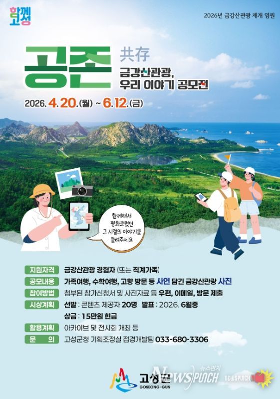 뉴스펀치 조평훈 기자 | 평화 경제 거점 도시 강원 고성군은 금강산관광의 사회적 가치와 국민의 소중한 기억을 재조명하고, 고성 평화경제특구 지정에 대한 공감대를 확산하기 위해 '공존(共存): 금강산관광, 우리 이야기' 공모전을 개최한다고 밝혔다.
