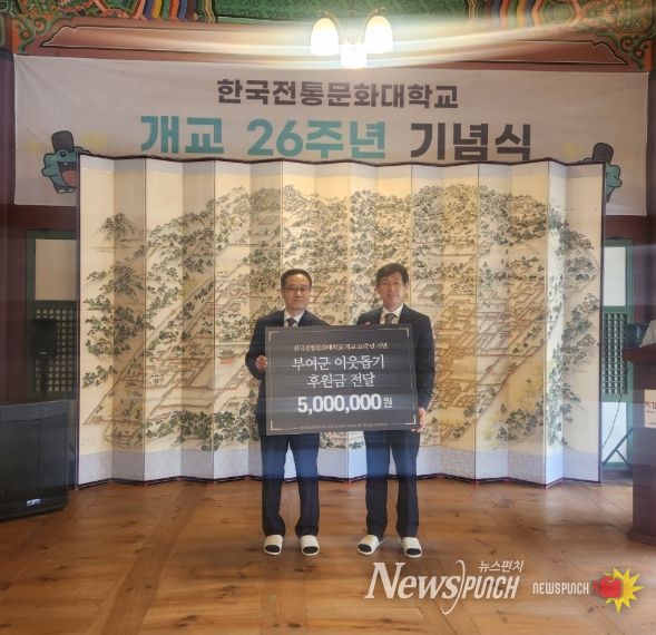뉴스펀치 이현승 기자 | 한국전통문화대학교 교직원일동은 개교 26주년 기념행사에서 저소득 가구의 초·중·고 학생 장학금으로 사용해 달라며 이웃돕기 성금 500만 원을 부여군에 기탁했다고 22일 밝혔다.