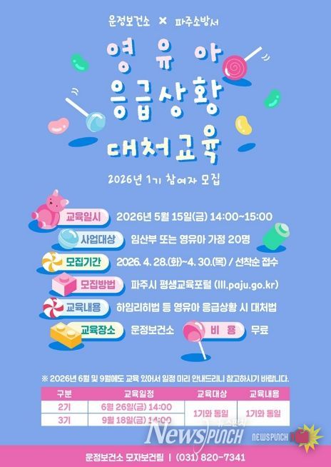 뉴스펀치 박상훈 기자 | 파주시 운정보건소는 영유아 가정의 안전 역량 강화를 위해 파주소방서와 연계해 ‘영유아 응급상황 대처교육’을 실시한다.