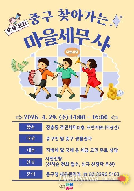 뉴스펀치 박상훈 기자 | 서울 중구는 구민들이 일상에서 겪는 세금 고민을 보다 쉽고 편하게 해결할 수 있도록 오는 29일 오후 2시 장충동 주민센터 2층에서 '찾아가는 마을세무사'를 운영한다.