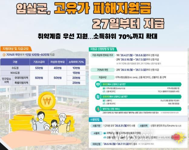 이번 지원은 2026년 3월 30일 기준 임실군에 주소를 둔 군민을 대상으로 하며, 기초생활수급자와 차상위가구, 한부모 가족을 비롯해 소득 하위 70% 범위에 해당하는 군민까지 폭넓게 포함된다.