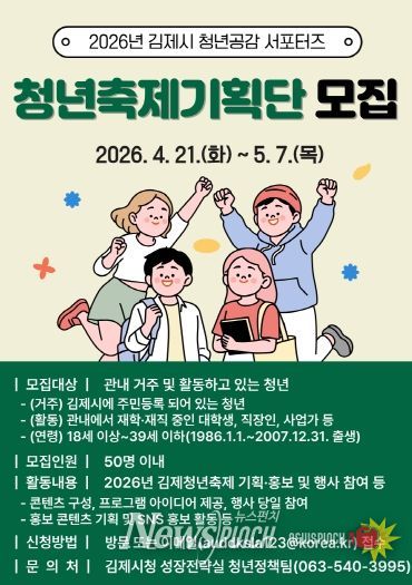 뉴스펀치 정홍균 기자 | 김제시는 청년이 주도하는 축제 기획을 통해 지역 청년 참여를 확대하고 활력을 불어넣고자 '청년축제기획단(김제시 청년공감 서포터즈)'을 모집한다고 밝혔다.