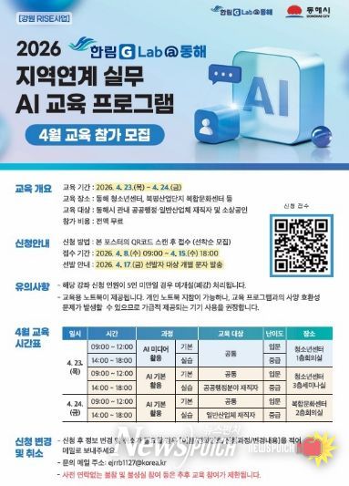 뉴스펀치 조평훈 기자 | 동해시와 한림대학교(총장 최양희)는 동해시 청소년센터와 북평산업단지 복합문화센터에서 공공행정 및 지역 산업체 종사자를 대상으로 직무 특성에 맞춘'한림 G-Lab@동해 지역 연계 실무형 AI 교육 프로그램'을 운영한다고 밝혔다.