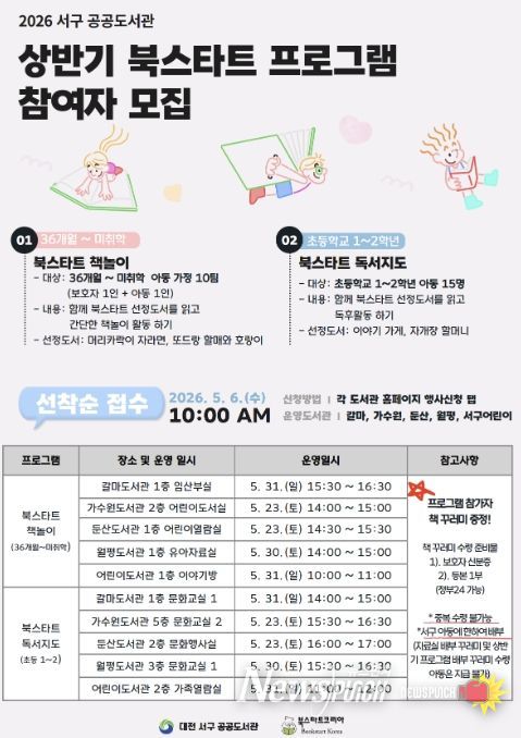 뉴스펀치 이현승 기자 | 대전 서구 5개 공공도서관(갈마·가수원·둔산·월평·어린이)은 영유아와 어린이들의 건강한 독서 습관 형성을 돕기 위해 2026년 상반기 ‘북스타트 프로그램’을 운영한다.