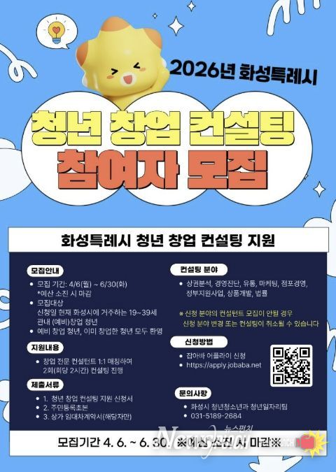 뉴스펀치 박상훈 기자 | 화성특례시는 오는 6월 30일까지 ‘2026년 청년 창업 컨설팅 지원사업’ 참여자를 모집한다.
