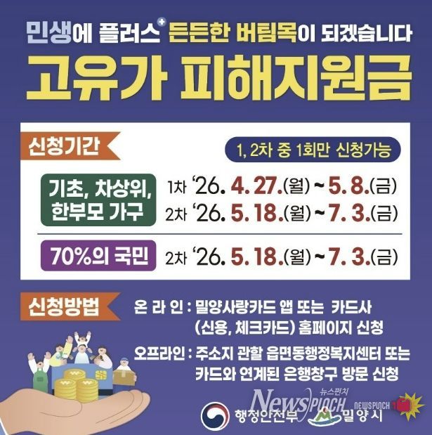 뉴스펀치 박세훈 기자 | 경남 밀양시는 고유가로 인한 시민 부담 완화를 위해 4월 27일부터 7월 3일까지 ‘고유가 피해지원금’ 신청을 접수한다.