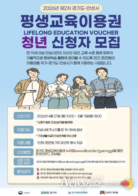 뉴스펀치 박상훈 기자 | 안성시는 시민의 평생학습 참여 기회를 두텁게 보장하기 위해 오는 4월 27일 오전 10시부터 5월 11일 오후 6시까지 ‘2026년 제2차 경기도-안성시 평생교육이용권’ 지원 대상자를 모집한다고 밝혔다.