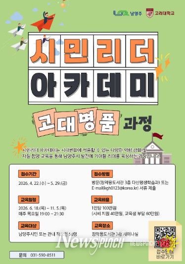 뉴스펀치 박상훈 기자 | 남양주시는 시민의 자치 역량 강화를 위해 ‘남양주시 시민리더 아카데미’ 제20기 수강생을 모집한다고 22일 밝혔다.