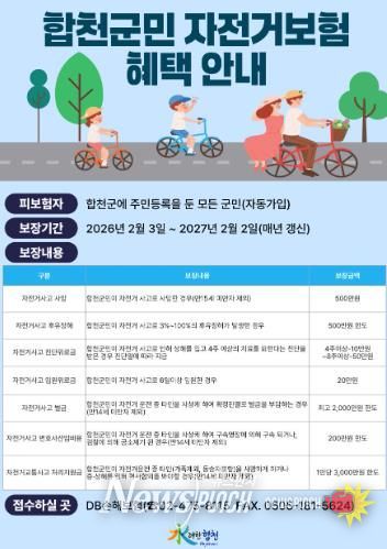 장재혁 합천군수 권한대행은 “자전거 이용 증가에 따라 사고 위험도 함께 높아지고 있는 만큼, 군민 자전거보험을 통해 사고 발생 시 경제적 부담을 덜고 보다 안전하게 자전거를 이용할 수 있도록 지원하고 있다”며 “앞으로도 자전거도로 정비와 안전시설 확충 등 다양한 정책을 통해 안전한 자전거 환경 조성에 힘쓰겠다”고 밝혔다.