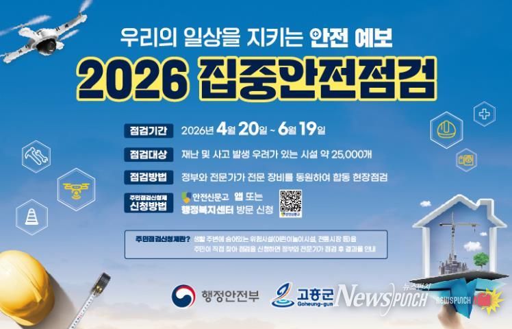 뉴스펀치 김용희 기자 | 고흥군은 재난과 안전사고 예방을 위해 4월 20일부터 6월 19일까지 2개월간 ‘2026년 집중안전점검’을 실시한다고 밝혔다.