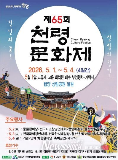 뉴스펀치 박세훈 기자 | 함양군을 대표하는 종합문화축제 ‘제65회 천령문화제’가 오는 5월 1일부터 4일까지 4일간 천년의 숲 상림공원 일원에서 열린다.