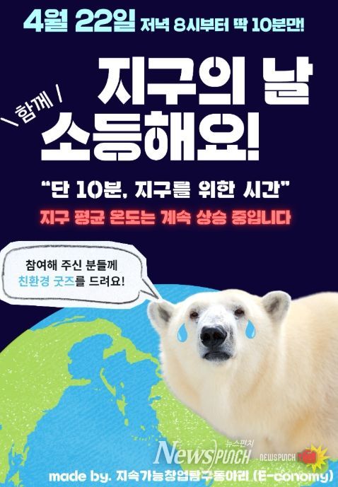뉴스펀치 이현승 기자 | 충북비즈니스고등학교(교장 윤승자)는 제56주년 '지구의 날'을 맞아 22일 수요일 오후 8시부터 교직원과 학생 등 100여 명이 참여하는 소등행사를 운영한다.
