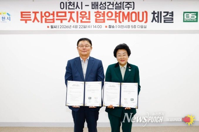 뉴스펀치 박상훈 기자 | 이천시가 22일 배성건설㈜와 203억 원 규모의 투자업무지원협약을 체결하고, 기업의 신규 공장 신설을 본격 지원한다.