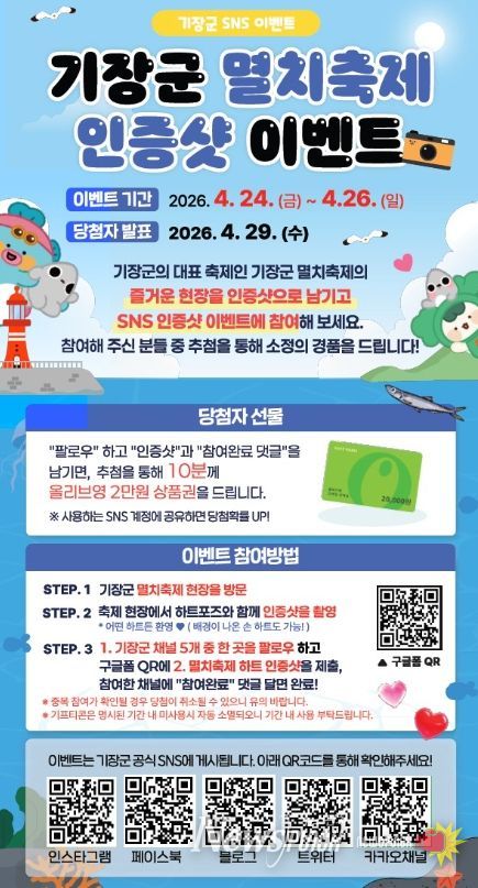 이번 이벤트는 기장군을 대표하는 축제인 기장멸치축제를 찾는 관광객들이 보다 즐겁게 축제를 체험하고, 기장군 공식 SNS 채널을 통해 군정 소식을 보다 친근하게 접할 수 있도록 기획됐다.