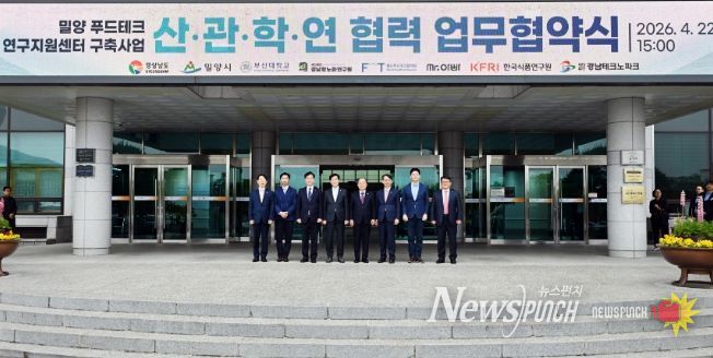 뉴스펀치 박세훈 기자 | 경상남도는 22일 밀양시청에서 ‘밀양 푸드테크 연구지원센터 구축’을 위한 산·관·학·연 협력 업무협약(MOU)을 체결하고, 농림축산식품부가 추진하는 105억 원 규모의 ‘푸드테크 연구지원센터 구축사업(스마트유통 분야)’ 공모 준비에 본격 착수했다.