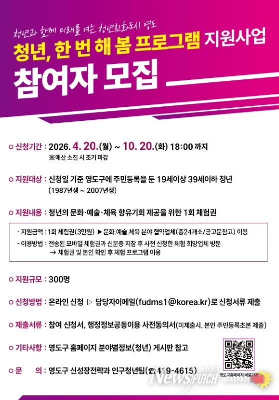 뉴스펀치 김윤걸 기자 | 부산 영도구는 청년들에게 문화 향유 기회를 제공하고 지역 청년문화 활성화를 도모하기 위해 '청년, 한 번 해 봄 프로그램 지원사업' 참여자를 이달 20일부터 10월 20일까지 모집한다고 밝혔다.