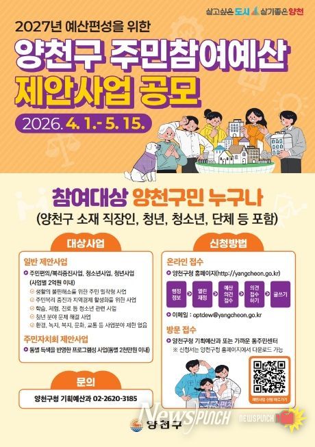 뉴스펀치 박상훈 기자 | 양천구는 2027년 예산 편성 과정에 구민의 목소리를 반영하기 위해 ‘주민참여예산 제안사업’ 공모를 오는 5월 15일까지 진행한다고 밝혔다.