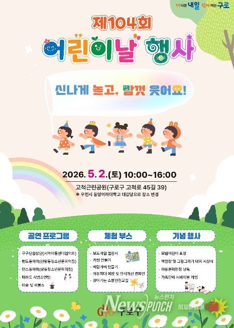 뉴스펀치 박상훈 기자 | 구로구가 제104회 어린이날을 맞아 오는 5월 2일 고척근린공원에서 어린이와 가족, 지역주민이 함께 즐길 수 있는 ‘어린이날 행사’를 개최한다.