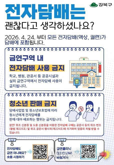 이순희 강북구청장은 “전자담배 역시 금연구역에서 사용할 수 없는 대상이라는 점을 분명히 알리고, 청소년 보호와 간접흡연 예방을 위해 법령 준수가 필요하다”며 “앞으로도 금연 환경 조성과 구민 건강 증진을 위한 정책을 지속적으로 추진하겠다”고 말했다.