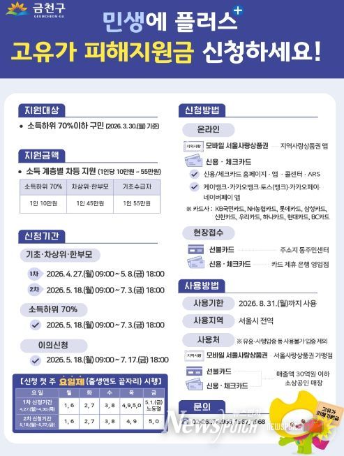 뉴스펀치 박상훈 기자 | 금천구는 중동 정세 불안 등으로 촉발된 고유가·고환율·고물가 상황에서 구민의 생활 부담을 완화하고 지역경제를 활성화하기 위해 오는 27일부터 ‘1차 고유가 피해지원금’ 신청 접수 및 지급을 시작한다고 밝혔다.