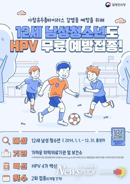 뉴스펀치 조평훈 기자 | 원주시보건소는 오는 5월 6일부터 12세 남성 청소년(2014년생)을 대상으로 사람유두종바이러스(HPV) 백신 국가예방접종 지원사업을 시작한다.