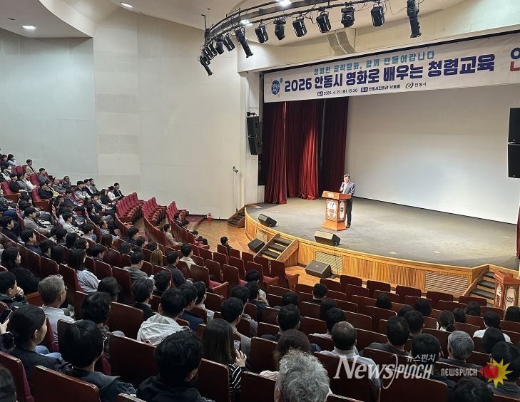 뉴스펀치 박세훈 기자 | 안동시는 4월 21일 안동시민회관 낙동홀에서 시 소속 공무원 및 공직유관단체 직원 380여 명이 참석한 가운데 ‘2026년 영화로 배우는 청렴교육’을 실시했다.
