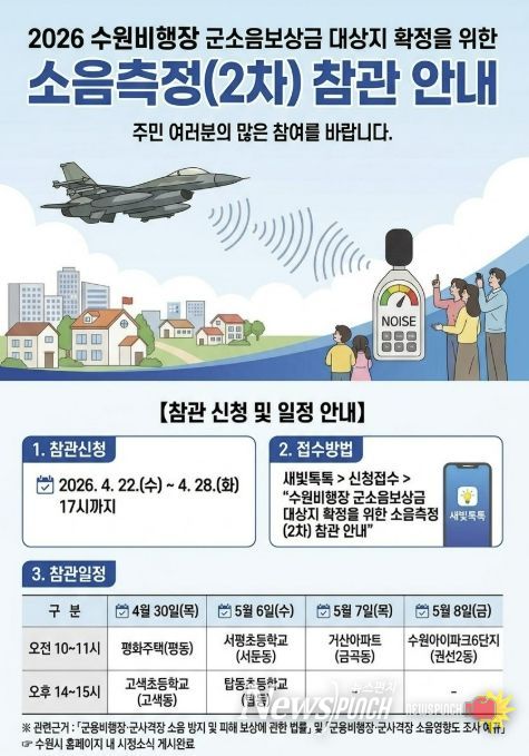 뉴스펀치 박상훈 기자 | 수원특례시가 수원비행장 인근 주민들의 소음 피해 보상 근거가 될 국방부의 ‘수원비행장 소음 영향도 조사 2차 소음측정’ 주민 참관 참여자를 모집한다. 4월 28일까지 새빛톡톡으로 신청할 수 있다.