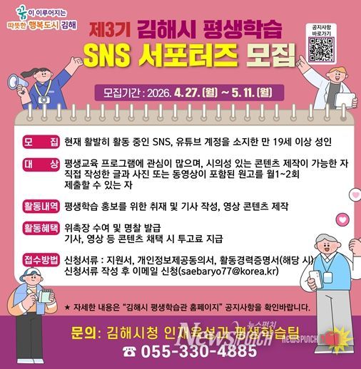 뉴스펀치 박세훈 기자 | 김해시는 27일부터 5월 11일까지 제3기 김해시 평생학습 SNS 서포터즈를 모집한다.