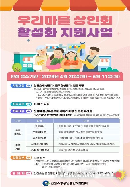 사업 신청 접수는 4월 20일부터 5월 11일까지 진행되며, 자세한 사항은 인천소상공인종합지원센터 누리집 및 인천소상공인종합지원포털 성장대로를 통해 확인할 수 있다.
