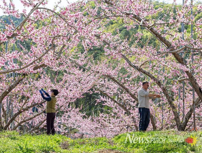 뉴스펀치 이현승 기자 | 충북 괴산군 청천면 금평리에서 연분홍 복숭아꽃이 활짝 피며 농가에 봄기운을 더하고 있다.