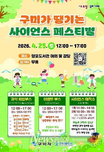 뉴스펀치 박세훈 기자 | 구미과학관은 4월 과학의 달을 맞아 4월 25일 구미어린이과학체험관(양포도서관 내) 일원에서 '구미가 땡기는 사이언스 페스티벌'을 개최한다. 과학을 놀이처럼 즐길 수 있도록 구성한 참여형 행사로, 시민 누구나 부담 없이 참여할 수 있다.
