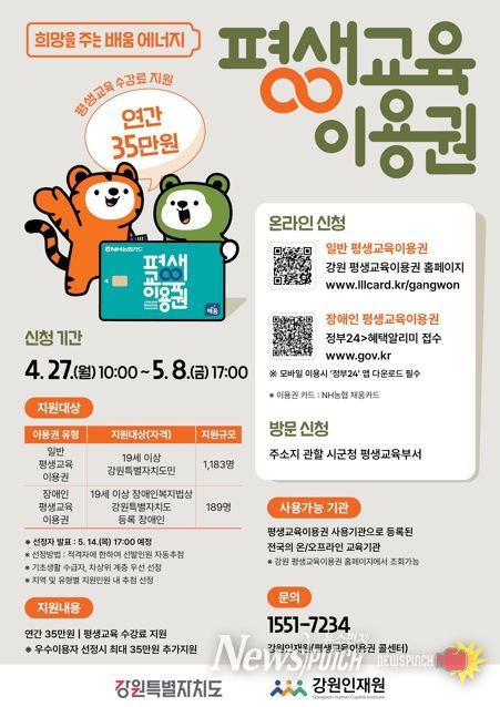 뉴스펀치 조평훈 기자 | 홍천군이 경제적 여건에 따른 교육 격차를 줄이고 평생교육 소외계층 성인의 자아실현을 돕기 위해 ‘2026년 강원특별자치도 평생교육이용권 2차 신청’을 4월 27일부터 5월 8일까지 받는다.