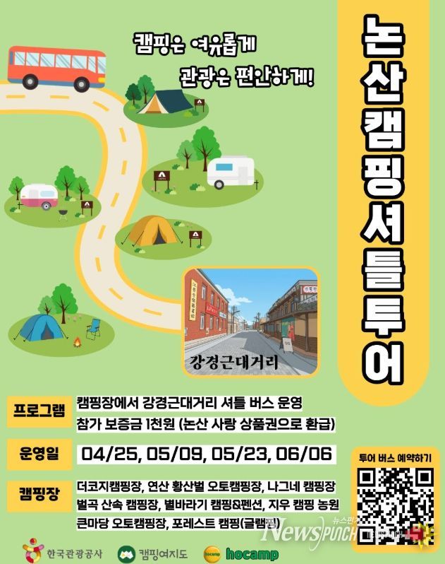 뉴스펀치 이현승 기자 | 논산시는 4월 25일부터 강경근대거리의 관광 매력을 널리 알리고 체류형 관광 활성화를 위해 ‘논산 캠핑 셔틀버스’ 프로그램을 운영한다.