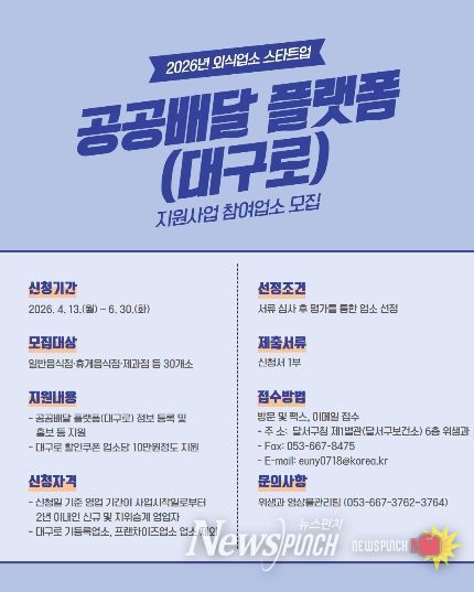 뉴스펀치 조평훈 기자 | 대구 달서구는 신규 외식업소의 조기 정착과 경영 안정화를 돕기 위해 ‘2026년 외식업소 스타트업 공공배달 플랫폼 지원사업’을 추진한다.