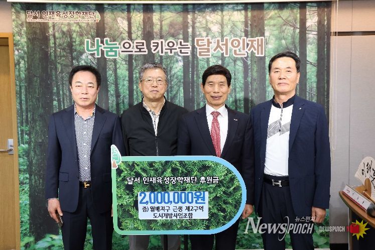 뉴스펀치 조평훈 기자 | 대구 달서구는 월배지구 근생 제2구역 도시개발사업조합(조합장 김희동)으로부터 지역 인재육성을 위한 장학금 200만 원을 (재)달서인재육성장학재단에 기탁받았다고 23일 밝혔다.