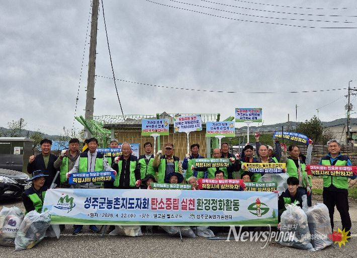 뉴스펀치 박세훈 기자 | 성주군은 4월 22일 성주읍 대황리 헬스로드(대흥교) 일원에서 농촌지도자 회원 20여 명이 참여한 가운데 탄소중립 실천을 위한 환경정화 활동을 실시했다고 밝혔다.
