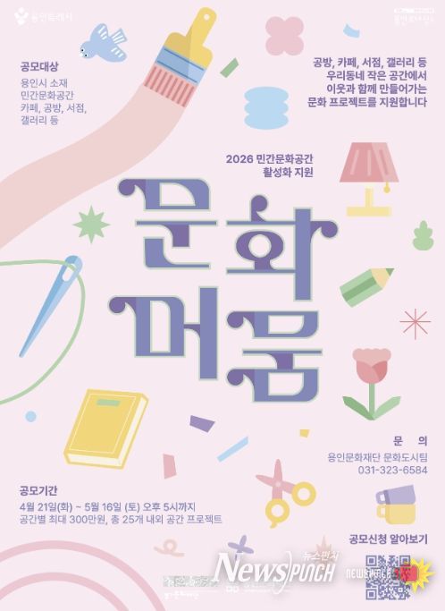 뉴스펀치 박상훈 기자 | 용인문화재단은 오는 5월 16일까지 ‘민간문화공간 활성화 지원사업 '문화머뭄'’의 참여 공간을 모집한다고 밝혔다. 지난해 25개소 공간에서 203회의 프로그램을 운영하며 2,101명의 시민 참여를 이끌어낸 ‘문화머뭄’ 사업은 올해 재단 자체 재원을 매칭하여 총 25개소의 민간문화공간을 선정하고, 공간별 최대 300만 원까지 프로젝트 운영비를 지원할 예정이다.