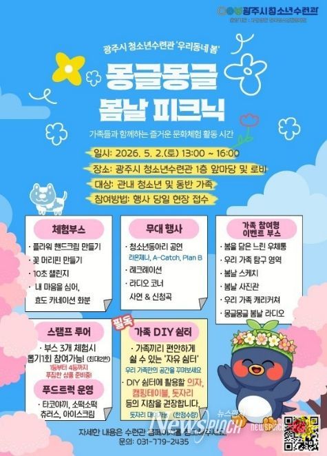 뉴스펀치 박상훈 기자 | 광주시 청소년수련관은 오는 5월 2일 오후 1시부터 수련관 1층 앞마당 및 로비에서 ‘2026년 우리동네 봄 몽글몽글 봄날 소풍’을 개최한다고 23일 밝혔다.