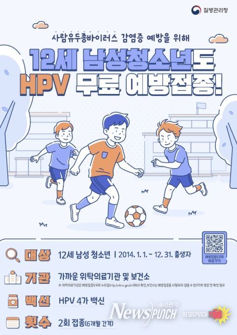기존에는 여성청소년과 일부 저소득층 여성에게 제공되던 무료 접종이 12세 남성 청소년(2014년생) 대상으로 총 2회(6개월 간격) 무료 접종을 시작한다.