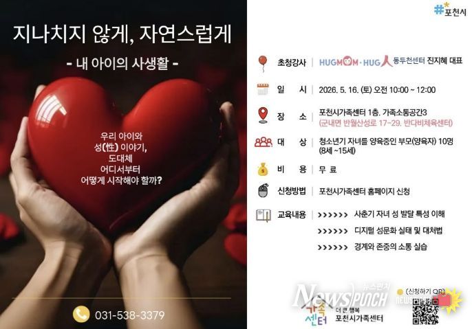 뉴스펀치 박상훈 기자 | 포천시 직영 더 큰 행복 포천시가족센터는 오는 21일부터 사춘기 자녀를 둔 양육자를 대상으로 부모 교육 프로그램 ‘지나치지 않게, 자연스럽게’의 참여자를 모집한다. 이번 교육은 5월 16일 오전, 포천시가족센터 가족소통공간(반다비체육센터 1층)에서 대면 강의로 진행된다.
