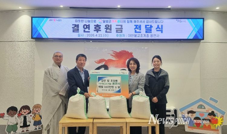 뉴스펀치 조평훈 기자 | 달성군가족센터(센터장 방승희)는 지난 22일 센터 내에서 대한불교조계종 용연사(주지 능도 스님)와 함께 ‘취약·위기 다문화가정 결연금 전달식’을 가졌다고 밝혔다. 이번 사업은 경제적 고통과 위기 상황에 놓인 관내 저소득 다문화 8가구를 돕기 위해 기획됐다.
