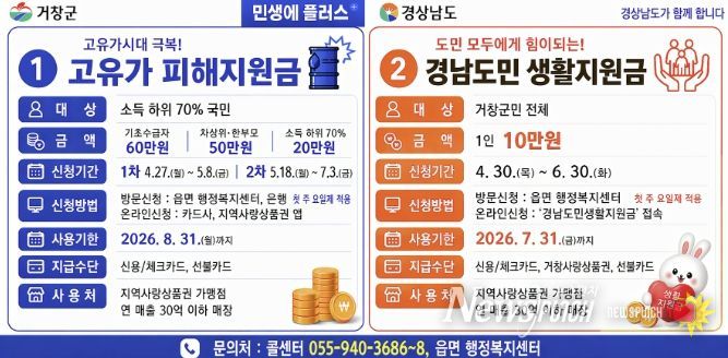 뉴스펀치 박세훈 기자 | 거창군은 장기화되고 있는 고유가와 경제침체에 어려움을 겪는 군민들의 생활안정을 위해 ‘고유가 피해지원금’과 ‘경남도민 생활지원금’을 지급한다.