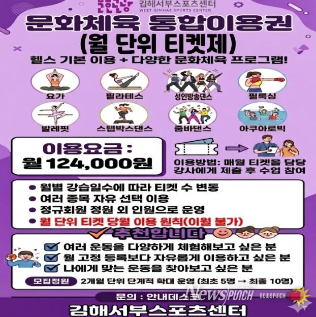 뉴스펀치 박세훈 기자 | (재)김해문화관광재단 김해서부스포츠센터는 이용자 중심의 유연한 운동환경 조성과 문화체육 프로그램 활성화를 위해 김해시 공공체육시설 최초로 ‘문화체육 티켓제 통합이용권’ 도입을 추진한다고 밝혔다.