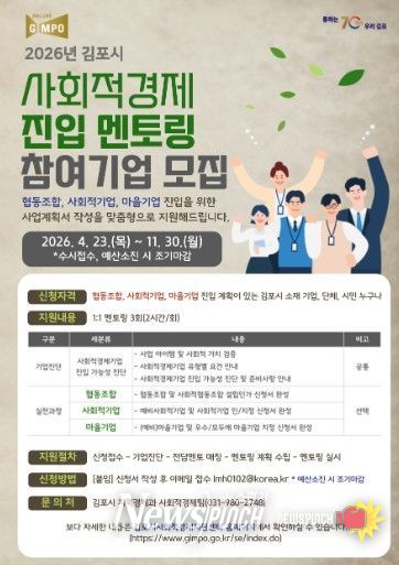 뉴스펀치 박상훈 기자 | 김포시는 협동조합, 사회적기업, 마을기업 등 사회적경제기업 진입을 지원하기 위해 ‘2026년 김포시 사회적경제 진입 멘토링’ 참여기업을 오는 11월 30일까지 수시 모집한다.