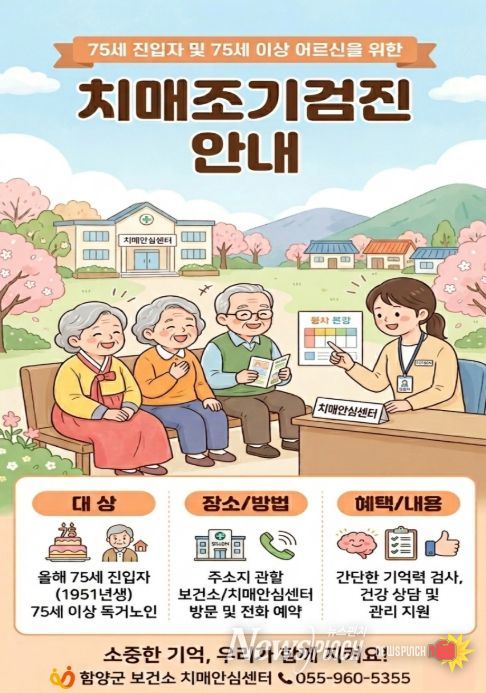 함양군 관계자는 “치매는 조기에 발견할수록 관리가 쉬워지고 삶의 질을 오래 지킬 수 있다”라며 “대상자들이 정기적인 검진에 참여해 건강한 노후를 준비할 수 있도록 적극 안내해 나가겠다”라고 말했다.