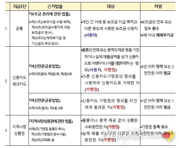 또한, 지역별 ‘부정유통 신고센터’를 운영하여 가맹점을 수시 단속하고 온라인 커뮤니티 등에서 개인 간 거래가 발생하지 않도록 모니터링을 강화해 줄 것을 각 지방정부에 요청했다.