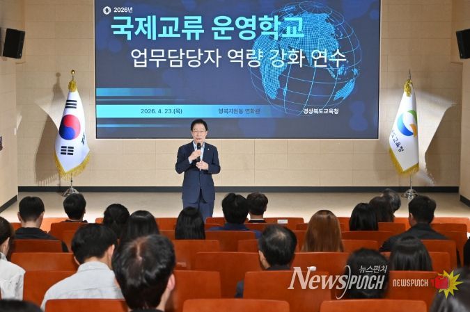 뉴스펀치 박세훈 기자 | 경북교육청은 23일 본청 행복지원동 연화관에서 도내 국제교류 운영교 업무 담당자와 관리자 등 150여 명이 참석한 가운데 ‘2026년 국제교류 운영학교 업무 담당자 역량 강화 연수’를 개최했다고 밝혔다.